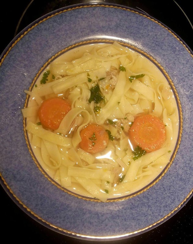 There is nothing as comforting as a hot bowl of chicken soup; especially, when it is accompanied by homemade egg noodles. This was one of Baba’s specialties. She would make it throughout the year. It was and still is a favourite of mine. (“Homemade Egg Noodles” recipe listed separately.)