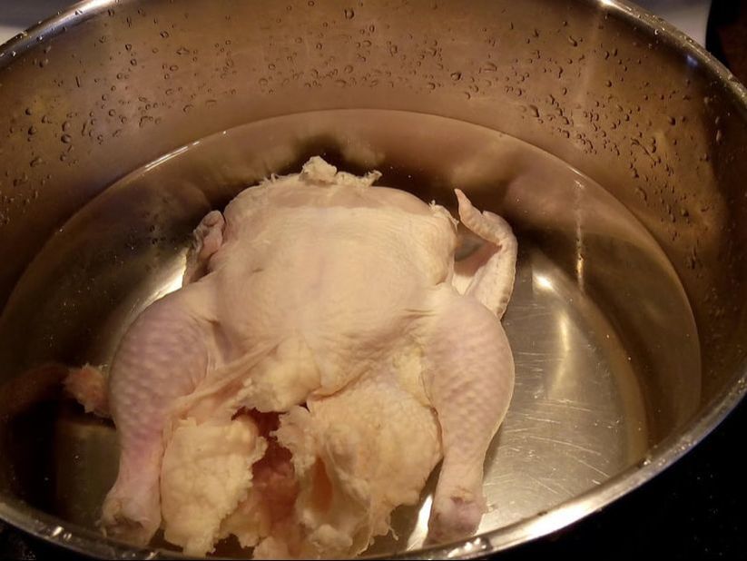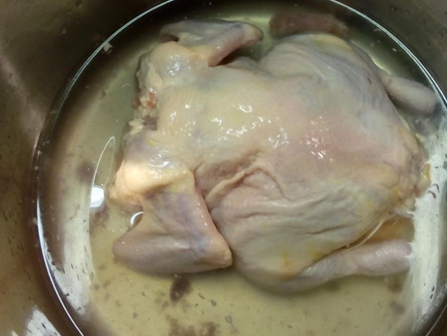 Clean chicken. Rinse in cold water and drain. Repeat.