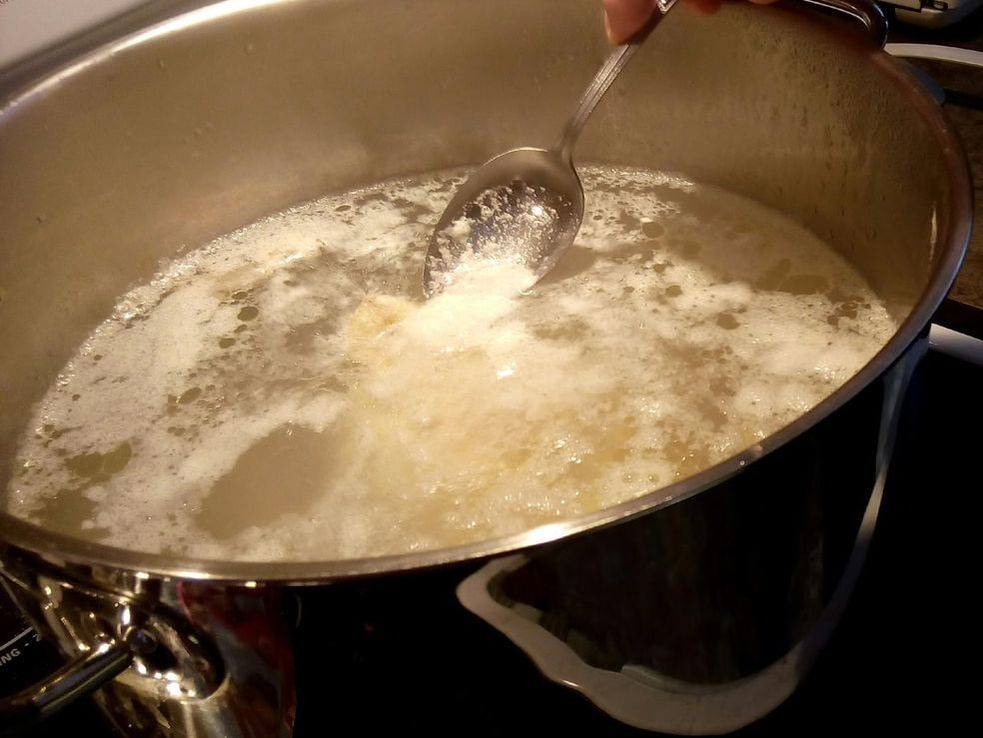 Bring to a boil. As soon as scum appears on the surface, remove it with a medal spoon. Continue doing this until it is free of scum.