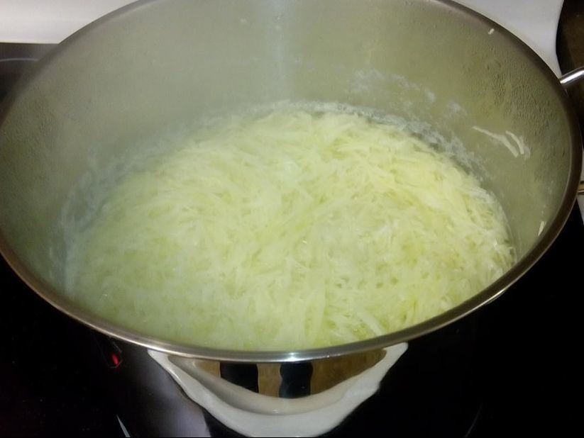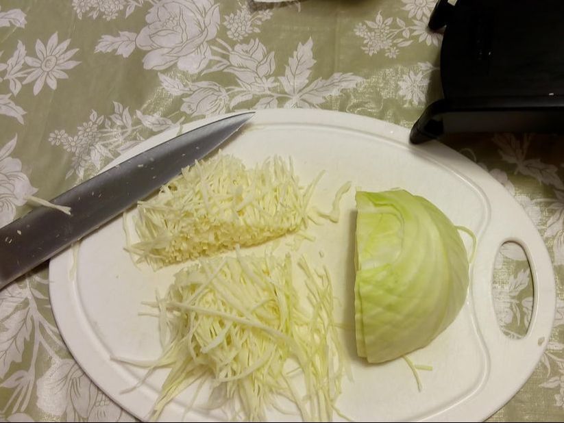 Fresh cabbage: remove outer layer, rinse, shred half the cabbage. Put in a large pot and cover with water. Add ¼ tsp. salt. Bring to a boil over medium heat. Boil for about 5 minutes. Drain and squeeze out excess water. Set aside.
