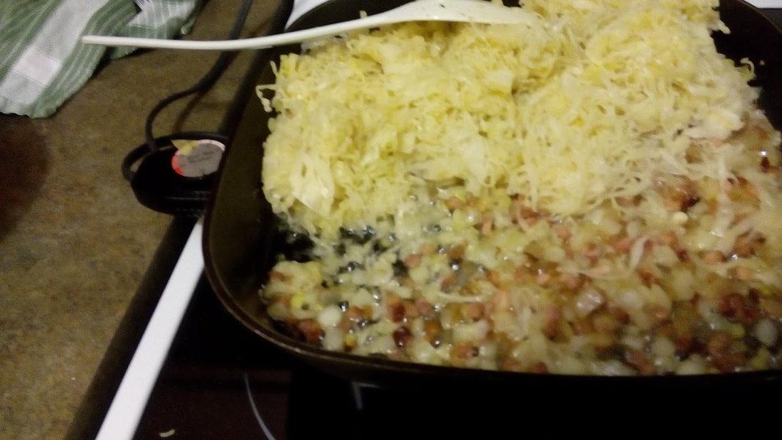 Add both cabbage and sauerkraut to fat and onion mixture. Cook in batches if necessary.