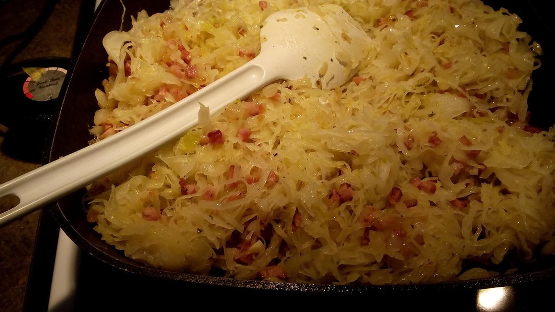 Cook and stir until there is no difference in colour between the cabbage and the sauerkraut.