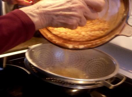 Cover, reduce heat and simmer until tender about 2 hours (stirring occasionally). When almost done, add salt. Drain. Reserve liquid for thinning. Mash beans well. Add some of the saved liquid until the mashed beans have the consistency of thick sour cream.