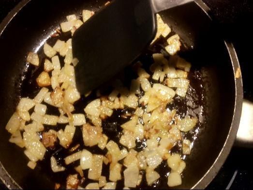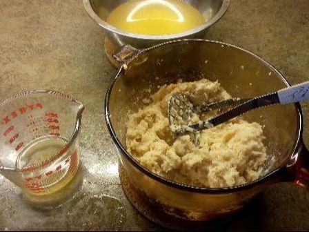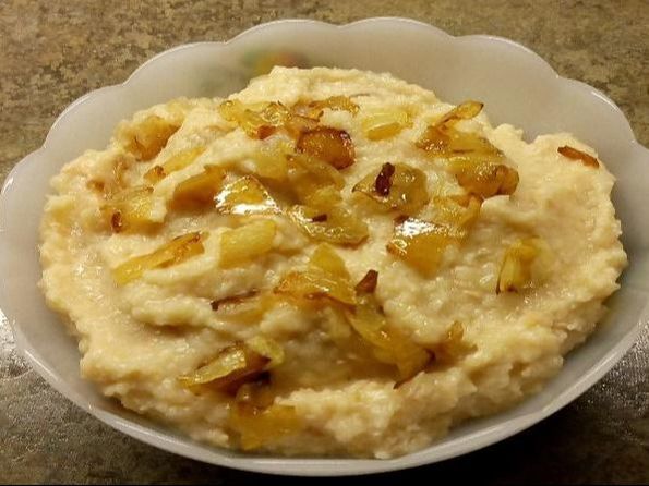 Mash in minced garlic (or sautéed garlic) a little at a time. Taste after each addition. Salt and pepper to taste. Saute’ onions until golden.