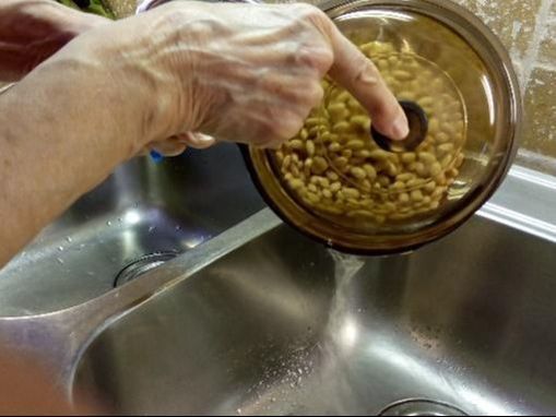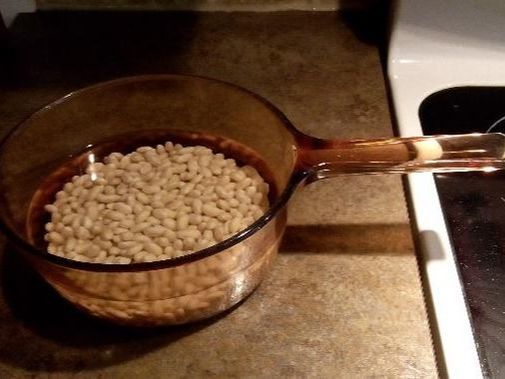 Rinse beans in cold water. Drain. Cover with two inches of cold water and soak 12 hours. Drain. Place beans in a large pot. Cover with 5 cups of cold water. Bring to a boil. Remove white foam.