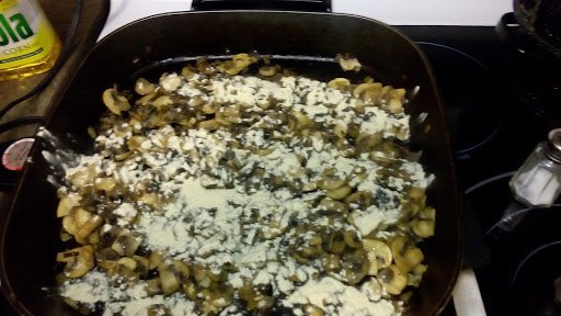 In a large fry pan, sauté onions in oil and garlic butter until soft. Add minced garlic and fresh mushrooms. Sauté over medium heat about 10 minutes.